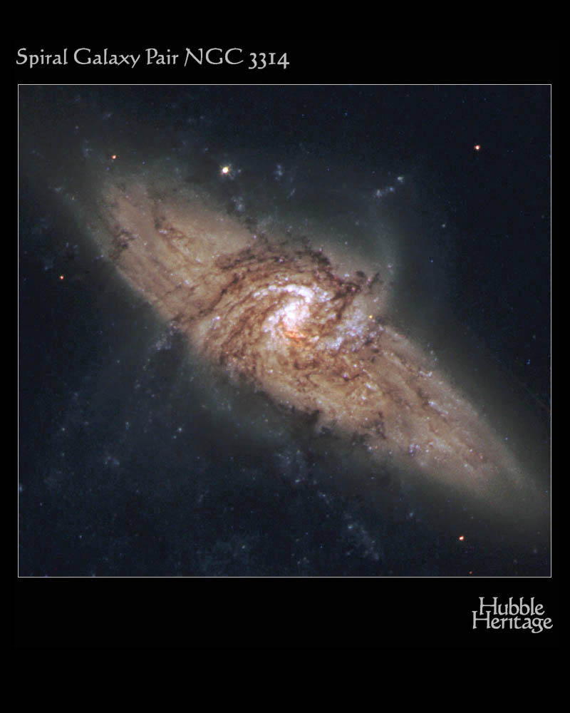 Astronomický snímek dne http://www.astro.cz/apod/ap050507.html | NGC 3314 se skládá ze dvou velkých spirálních galaxií, které se pouhou náhodou nacházejí přesně za sebou. Spirála v popředí je vidět skoro úplně zepředu a její tvar větrníku definují mladé jasné hvězdokupy. Ale proti svitu galaxie v pozadí jsou též vidět tmavé vířící pásy mezihvězdného prachu, které odrážejí zepředu viděnou spirální strukturu. Prachové pásy jsou překvapivě všudepřítomné a tento pozoruhodný pár překrývajících se galaxií je jedním z malého počtu systémů, u kterých se dá využít absorpce viditelného světla k přímému výzkumu distribuce prachu ve vzdálených spirálních galaxiích. NGC 3314 se nachází ve vzdálenosti asi 140 miliónů světelných let ve vícehlavém souhvězdí Hydra. Tento barevný kompozitní obraz vznikl ze snímků pořízených dalekohledem Hubble Space Telescope v letech 1999 a 2000. |