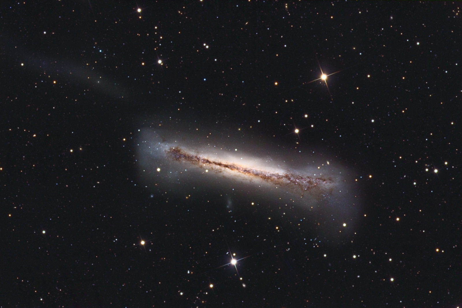 Astronomický snímek dne http://www.astro.cz/apod/ap050408.html | Tmavé prachové pásy, které protínají střed tohoto nádherného vesmírného ostrova jasně naznačují, že NGC 3628 je spirální galaxií viděnou zboku. NGC 3628 se nachází v severním jarním souhvězdí Lva (Leo) a je jediným členem dobře známého Lvího tripletu galaxií, který není ve slavném katalogu Charlese Messiera. Je jasně vidět, jak se u okraje disk galaxie NGC 3628 rozvětvuje, co do velikosti je ale tato galaxie podobná naší Mléčné dráze. Na tomto hloubkovém pohledu je vidět slabé rameno materiálu, které se rozprostírá doleva. Zborcený tvar a slapový ocas naznačují, že NGC 3628 je v gravitačním působení s ostatními spirálními galaxiemi Lvího tripletu M66 a M65. |