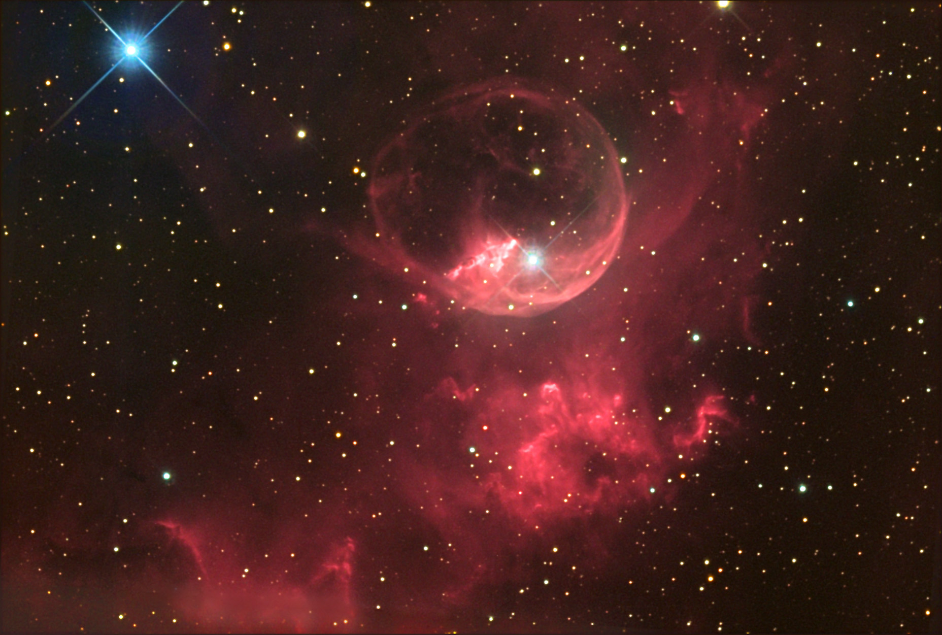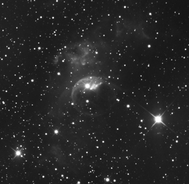 Astronomický snímek dne http://www.astro.cz/apod/ | Tento duchovitý, hvězdným větrem nafouknutý přelud je katalogizován jako NGC 7635, ale je též jednoduše znám jako mlhovina Bublina. Výtečný pohled od astronoma Kena Crawforda kombinuje dlouhou expozici přes vodíkový h-alfa filtr s barevnými snímky a tak odhaluje jemné podrobnosti této kosmické bubliny a jejího prostředí. Přestože vypadá velice delikátně, tak průměr bubliny přes 10 světelných let je důkazem přítomnosti bouřlivých procesů. Vlevo nahoře od středu Bubliny je jasná horká hvězda ponořená do vše vypovídajících odstínů modré, které jsou charakteristické pro světlo hvězd odražené od prachu. Prudký hvězdný vítr a intenzivní záření hvězdy, která má hmotnost 10 až 20 Sluncí, vyvrhl proti hustějšímu materiálu v okolním molekulárním mračnu útvar ze zářícího plynu. Úchvatná mlhovina Bublina leží asi 11 000 světelných let daleko v souhvězdí Kasiopeji (Cassiopeia). |